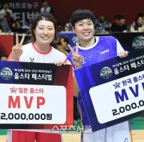 BNK썸 진안(오른쪽)과 일본 올스타팀의 오카모토 미유가 22일 부천체육관에서 열린 2024-2025 여자프로농구 올스타전에서 MVP로 선정된 뒤 기념촬영을 하고 있다. 2024. 12. 22.부천 | 박진업 기자 upandup@sportsseoul.com