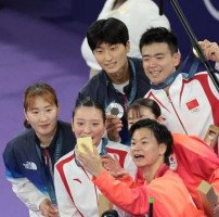 지난 2일(현지시간) 프랑스 파리 라 샤펠 아레나에서 열린 2024 파리올림픽 배드민턴 혼합복식 시상식에서 은메달을 딴 한국 김원호·정나은이 금메달의 중국, 동메달의 일본 선수들과 함께 갤럭시Z플립으로 사진 촬영을 하는 모습 [사진=연합뉴스]2024 파리올림픽에서 루이뷔통, 삼성전자 등 일부 후원사 제품이 노골적으로 등장…